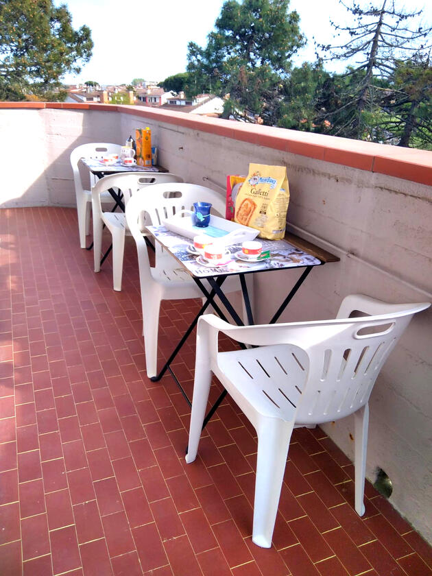 L' appartamento é dotato di un ampio terrazzo perimetrale. Soleggiato, attrezzato con tavolini e sedie per pranzi e cene all' aperto.